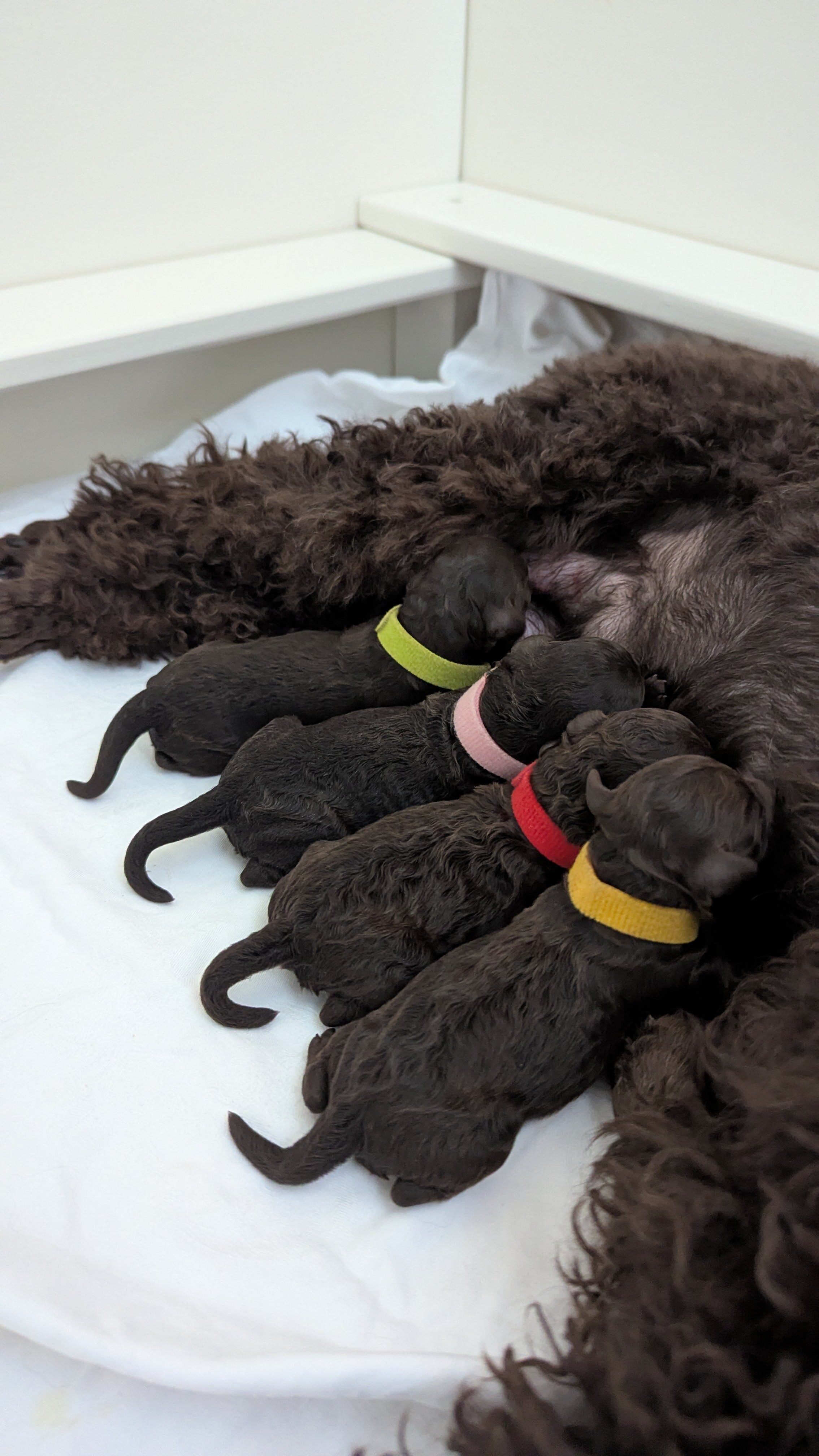 Es sind 2 Rüden und 2 Mädchen, alle in einem tiefen dunkelbraun. Sie werden wahrscheinlich große Zwergpudel werden.