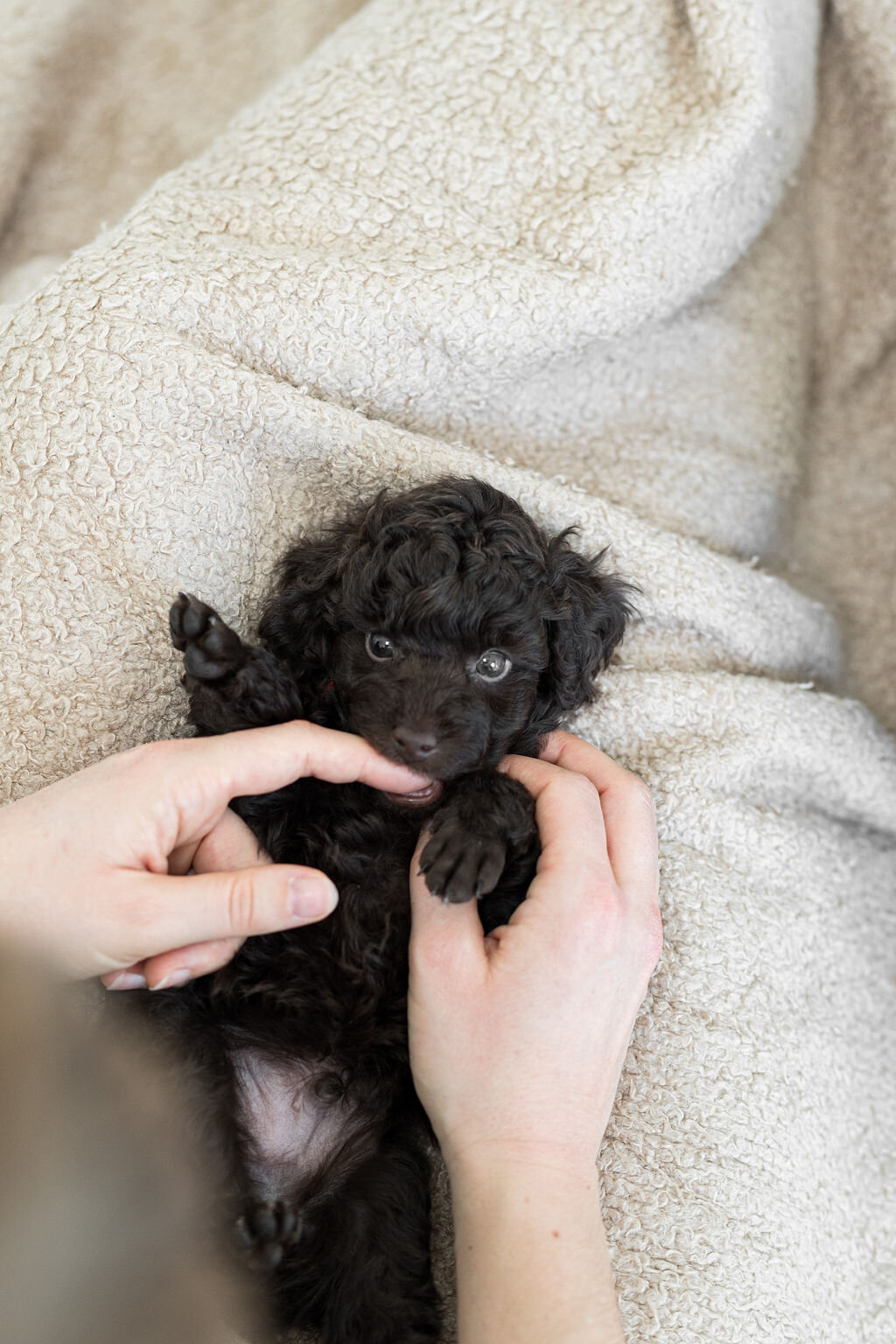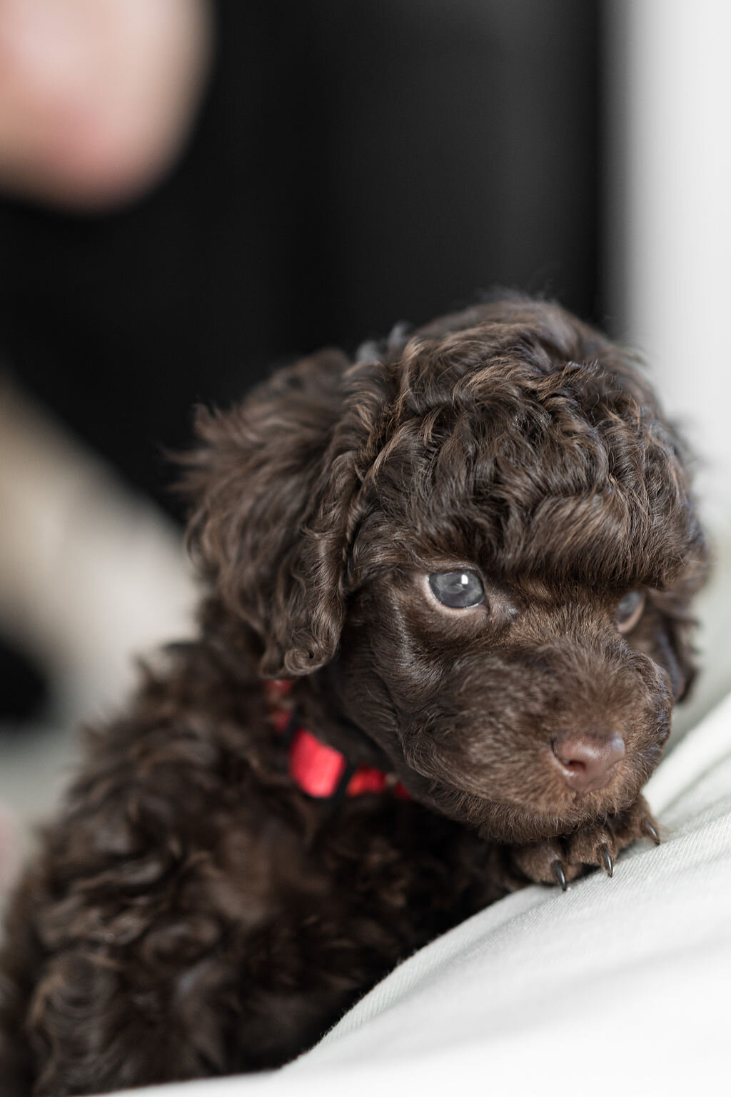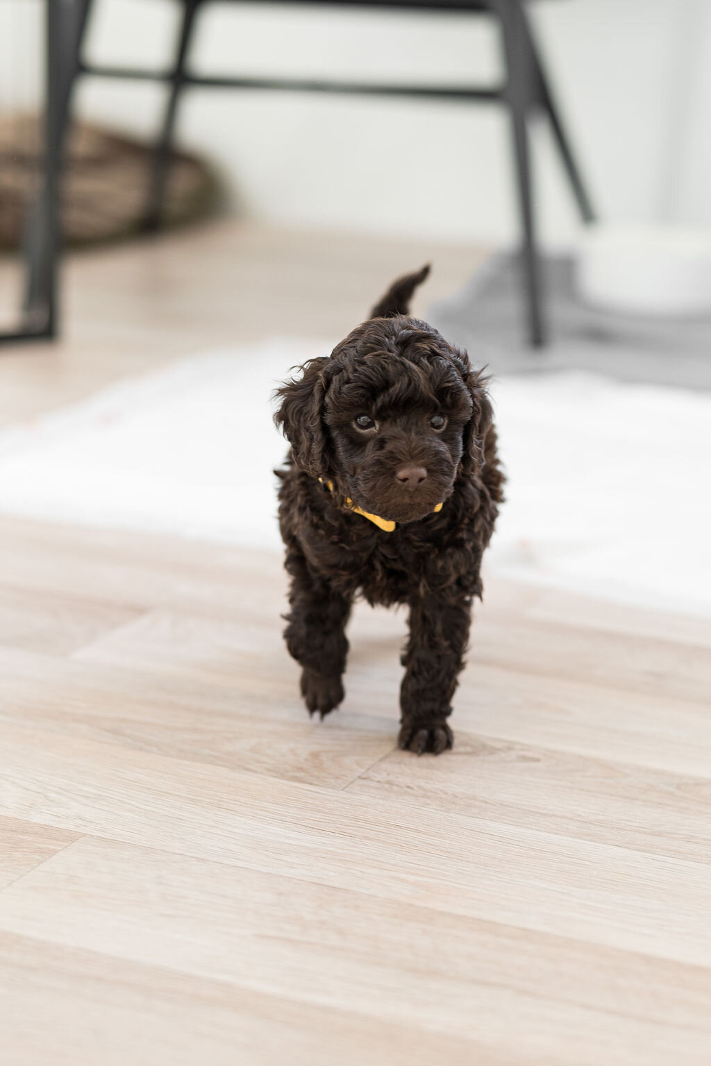 Es sind 2 Rüden und 2 Mädchen, alle in einem tiefen dunkelbraun. Sie werden wahrscheinlich große Zwergpudel / kleine Kleinpudel werden.